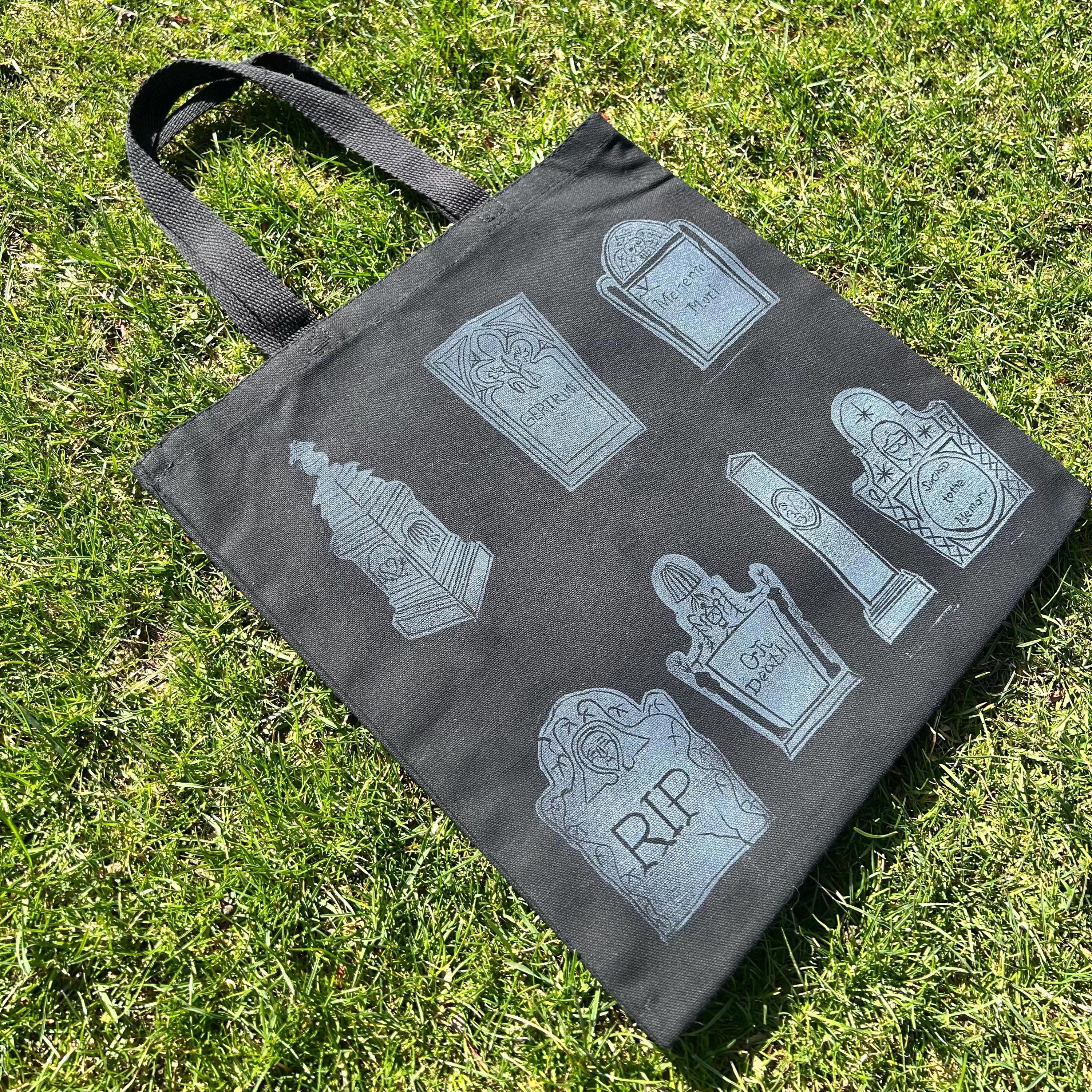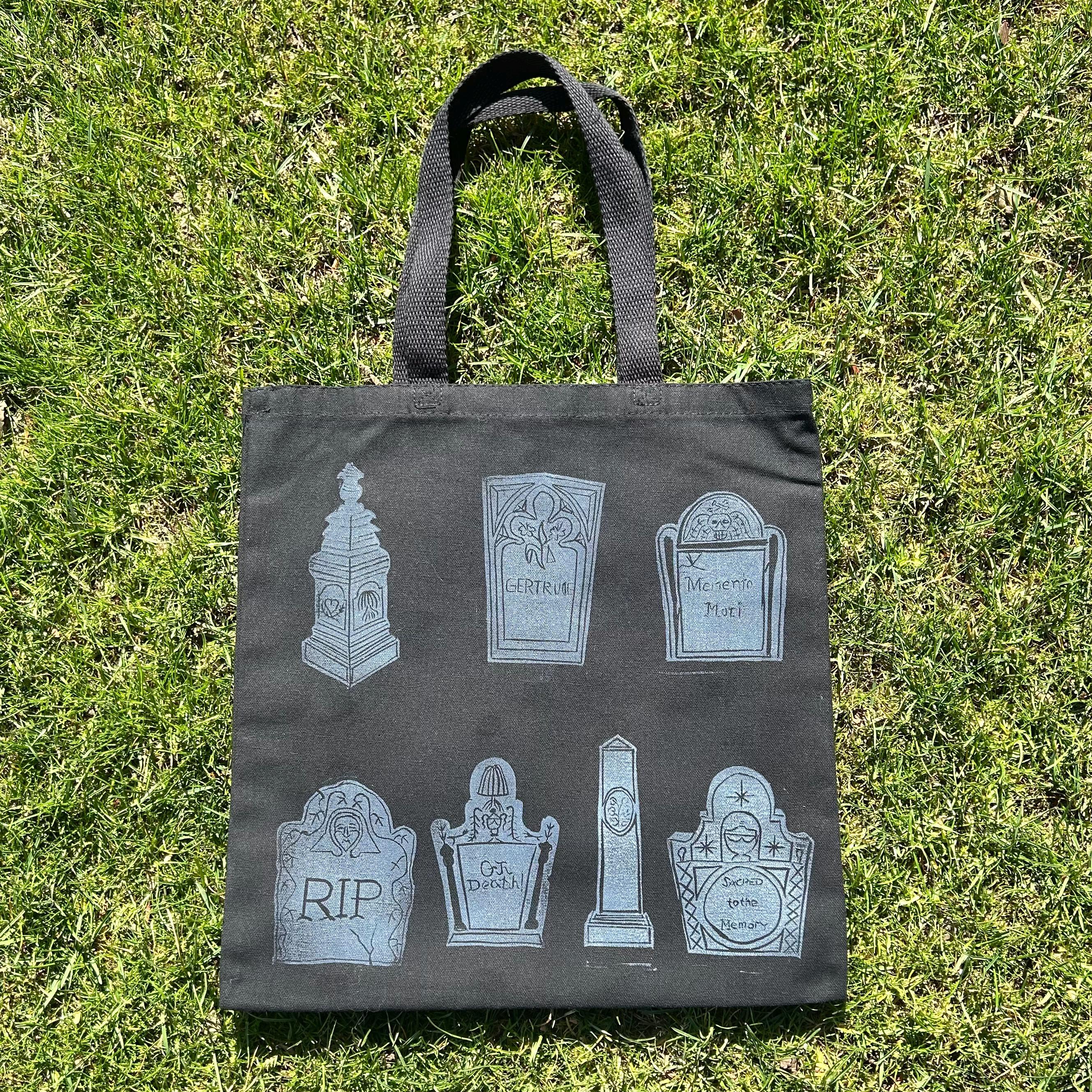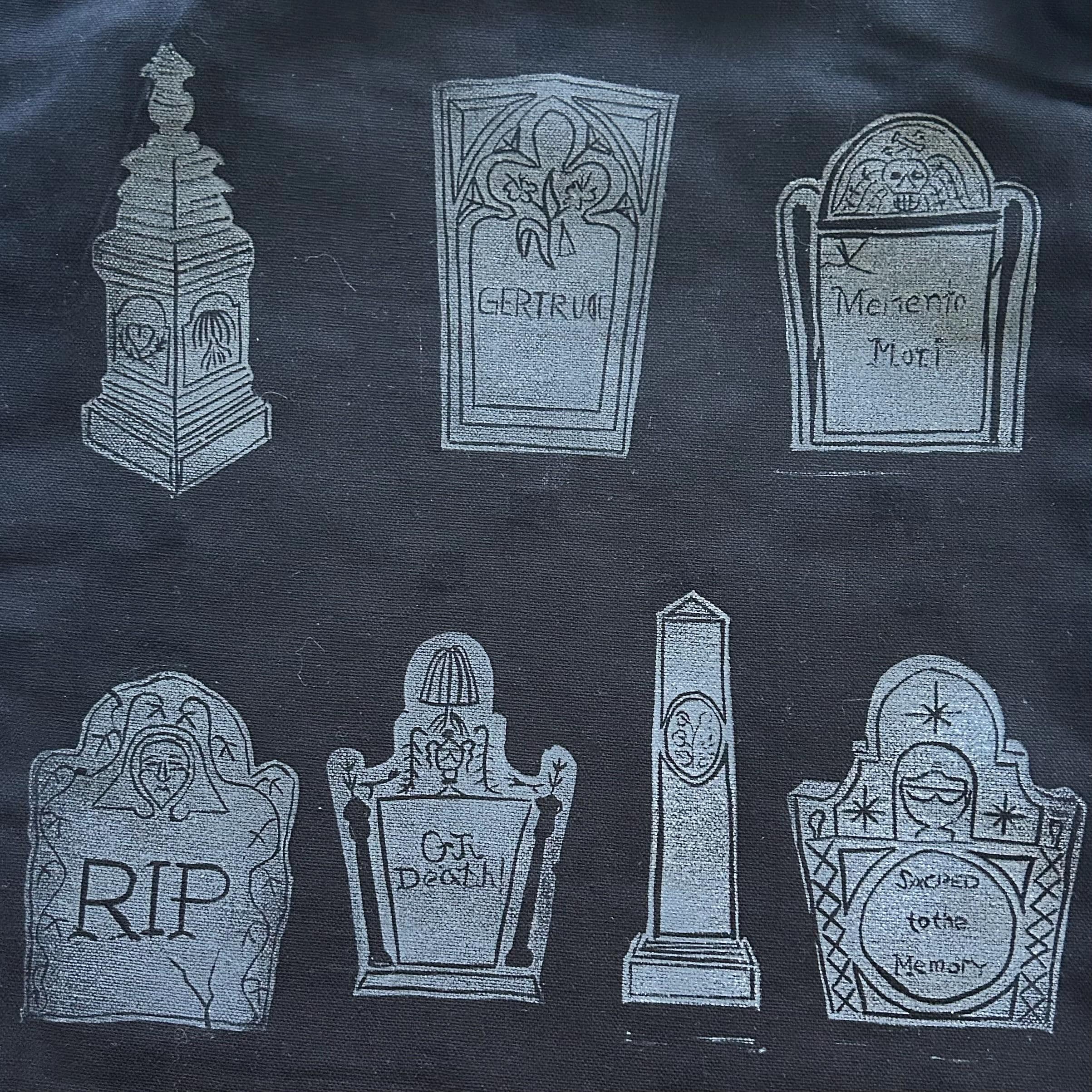 All headstones are based off of some of my favorite ones I have seen in New England. Each one was hand drawn, transferred to lino blocks, hand carved, and hand printed. Each one of these totes are their own piece, because of the hand printing process has variants.